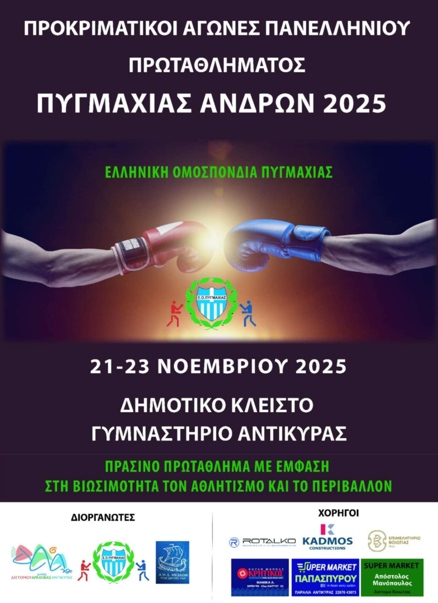 Προκριματικοί Αγώνες Πανελληνίου Πρωταθλήματος Πυγμαχίας Ανδρών 2025 PDF Loading... Download PDF + Προσθήκη στο Google Calendar + Εξαγωγή σε iCal / Outlook Ημερομηνία Νοέ 21 - 23 2025 Expired! Ώρα Όλη Μέρα Τοποθεσία Δημοτικό Κλειστό Γυμναστήριο Αντίκυρας Κοινοποίηση