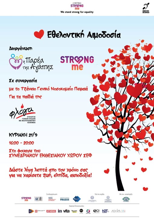 Η αιμοδοσία πραγματοποιείται από την «Παρέα της Αγάπης» σε συνεργασία με το Τζάνειο Γενικό Νοσοκομείο Πειραιά, ενώ το αίμα που θα συγκεντρωθεί θα παραδοθεί στη «ΦΛΟΓΑ», τον Σύλλογο Γονέων Παιδιών με Νεοπλασματική Ασθένεια, για την κάλυψη των αυξημένων αναγκών των παιδιών που δίνουν καθημερινά τη δική τους μάχη.