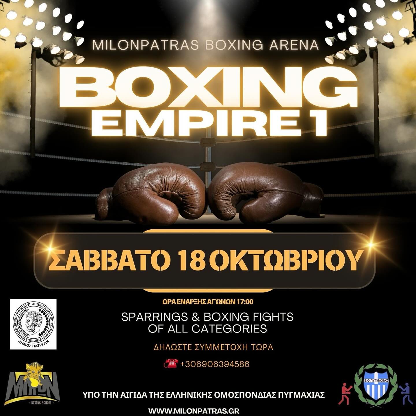 Η αρχή θα γραφτεί με το BOXING EMPIRE 1, το Σάββατο 18 Οκτωβρίου, σε μια σπουδαία διοργάνωση υπό την αιγίδα της Ελληνικής Ομοσπονδίας Πυγμαχίας.